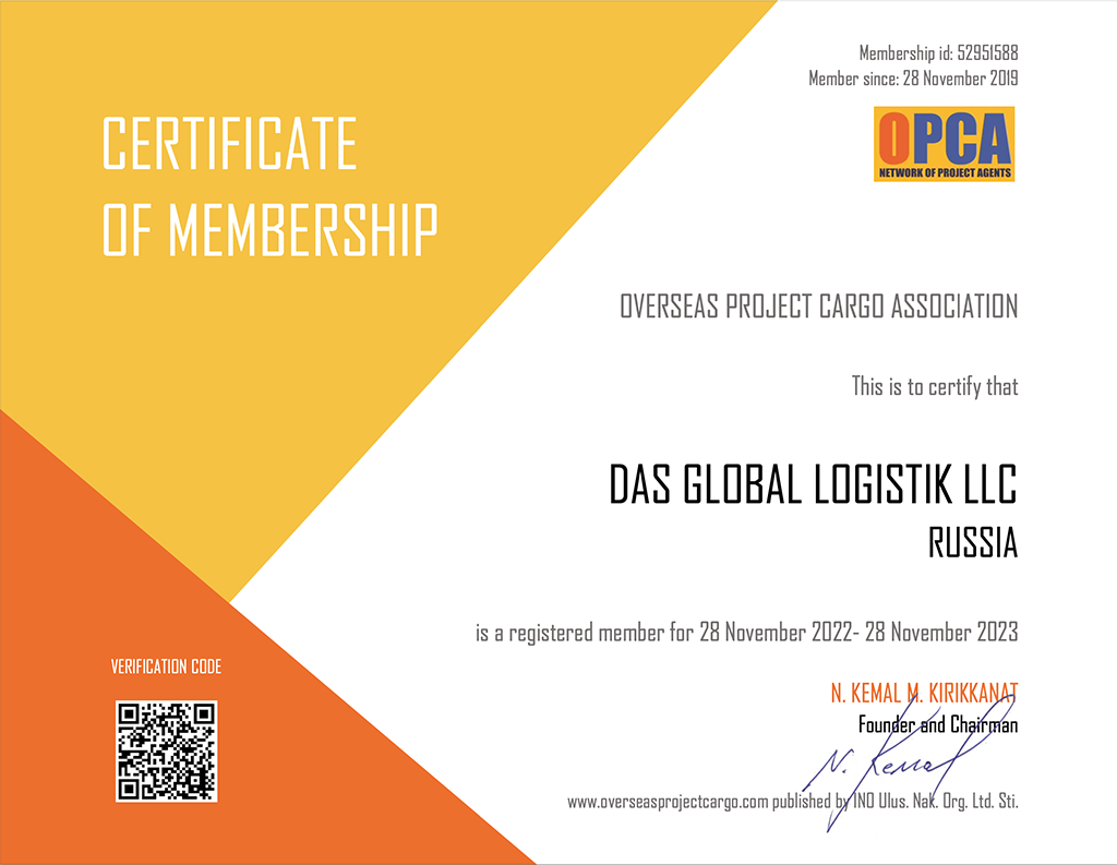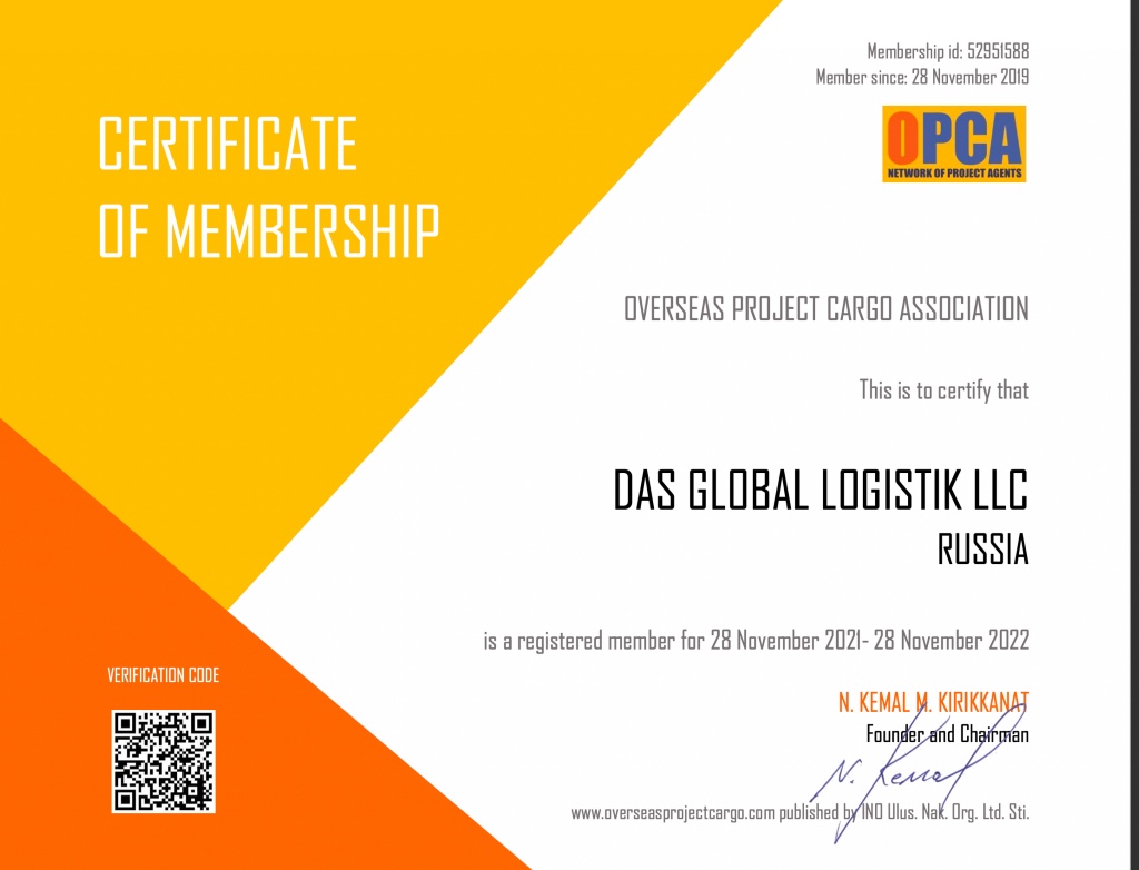 • Сертификат, подтверждающий членство в OPCA по проектным грузам на 2022 гг.