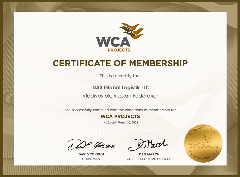 • Сертификат WCA PROJECTS, подтверждающий членство в международной ассоциации WCA PROJECTS по проектным грузам на 2026 г.